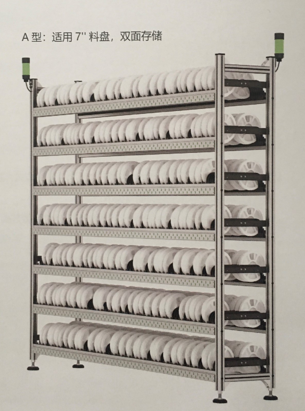 A型智能料架為標準7寸料盤存儲料架,雙面存放,1400個儲位,單色、多色可選,最大可支持7色。